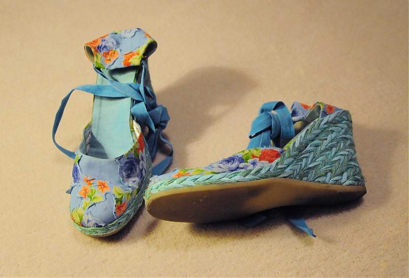 水蓝色绸面烂花藤编坡底系腕凉鞋(名字够长)。5。5号吧,反正35、36的脚丫都能穿吧。因为是系带的不会飞出去号不合适也就穿着了。TOWNSHOES的,原价税前八十多刀吧,因为穿得次数相对比较多有点脏但我没洗过,$15