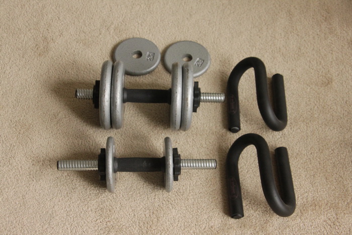 哑铃,俯卧撑push bar(貌似这么叫的,^_^) 哑铃 SOLD 俯卧撑的push bar,使用的时候可以让上半身下降得更低,加深对胸肌外侧和内侧的刺激,增强肌肉的柔韧性,如果不想去健身房的时候,这个是在家锻炼的很好辅助器材,只卖5刀