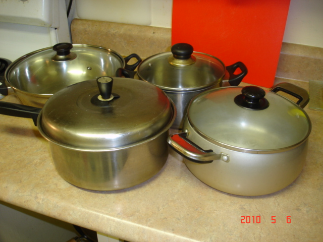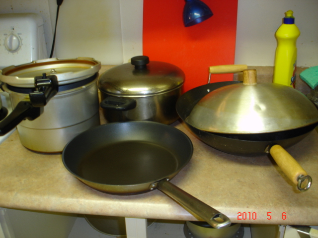 图二: 左1:$5(sold); 左2,3&4:$2 each; 右1&2 free 图三:锅 $3 each 图四:高压锅 $12(sold); 炒菜铁锅 $3; 平底锅 $5(sold); 大锅 $3