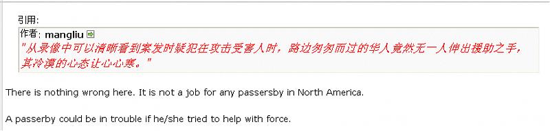 姚宇悲惨遇害,是令人发指的事件。希望您不要断章取意。那里说的,不是事件本身,而是路人是否应该拔刀相助与歹徒拼命。http://bbs.comefromchina.com/forum5/thread798792.html