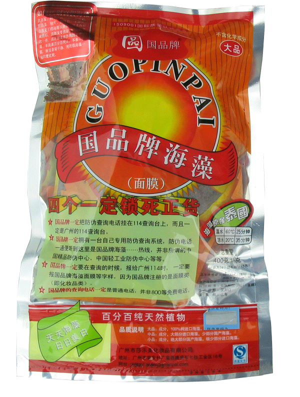 国品天然海藻面膜(净含量400克,24小袋大包装)是我去年9月回国在药妆店里买的,有效期至2012年7月。