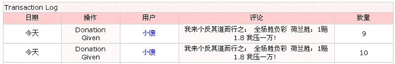 <TABLE class=tborder border=0 cellSpacing=1 cellPadding=2 width="100%" align=center><TBODY><TR align=middle><TD class=alt1>今天</TD><TD class=alt2>Donation Received </TD><TD class=alt1>西西妈</TD><TD class=alt2>晚不晚?还没干过这活儿。</TD><TD class=alt1>9,900</TD></TR><TR align=middle><TD class=alt1>今天</TD><TD class=alt2>Donation Received </TD><TD class=alt1>西西妈</TD><TD class=alt2>无</TD><TD class=alt1>10,000</TD></TR></TBODY></TABLE>西西妈,这两单没注明压谁,怎么压。要不听章鱼的,我都算成全场西班牙胜?
