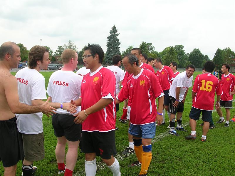 [FONT=宋体]半决赛的对手是渥太华媒体联队,该队不仅技术好,而且队员年轻,身体强壮。该队为了赢球,不惜违反规则,上了全部[/FONT]7[FONT=宋体]个男队员。中国社区队顽强拼搏,并没有因此而落下风,并充分利用规则,采用频繁换人的战术保持场上队员的体力,将比赛拖入了点球决战。范红宇主罚第一个点球就将球罚进;轮到对方的[/FONT]10 [FONT=宋体]号罚球,按照规则,他只有把球罚进才能进行第二轮罚球,否则将被淘汰。结果是,他将球罚偏[/FONT]………………….