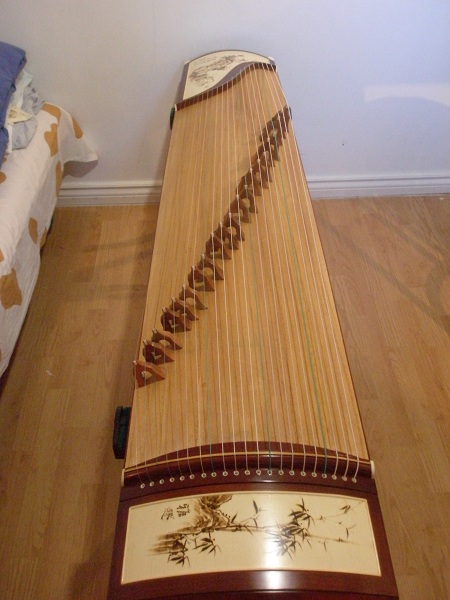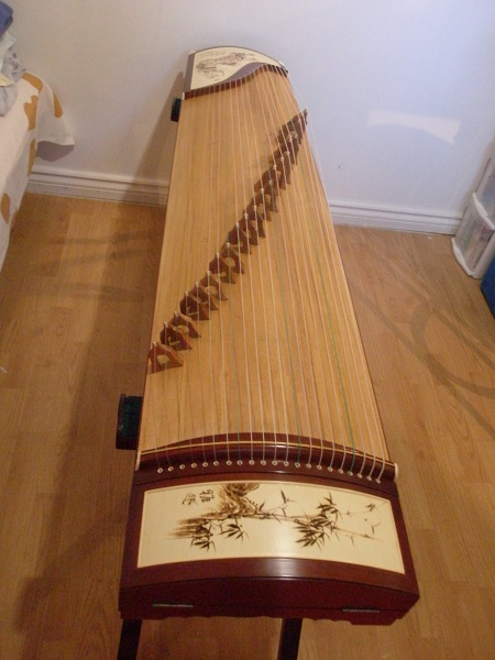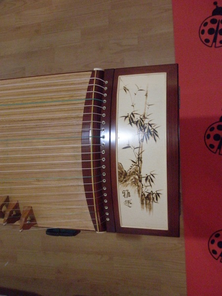 出售标准大小全新古筝一架(长163cm, 宽36cm,厚10cm),琴身是花梨木的,两端是雅竹图,男女都可用。这个木质可以在北方寒冷天气使用,不会裂。
