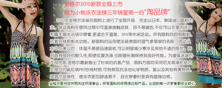 [FONT=宋体]本产品采用美国杜邦公司生产的“莱卡”面料,弹性好,抗氯性强,牢度强,具体表现在不易褪色,布料结构不易松开断裂,使用寿命长。金格尔泳衣穿着舒适。其还可抵挡泳池中的漂白剂,消毒水中的氯对于用意的破坏,防霉且不变形,从而保护您的皮肤![/FONT]