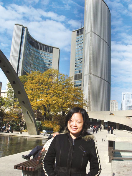 来自福建长乐的被拒难民潘锋梦想能留在多伦多升读大学,但恐难逃被遣返回国的命运。图為潘锋在多伦多市政厅前留影。​