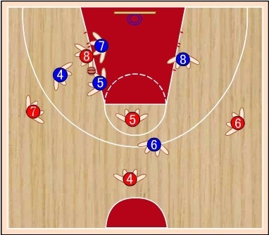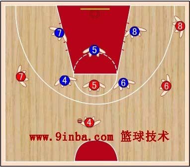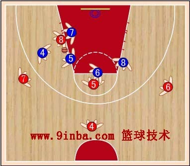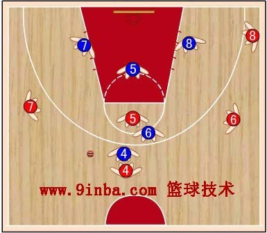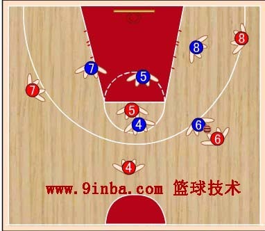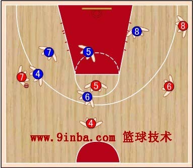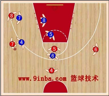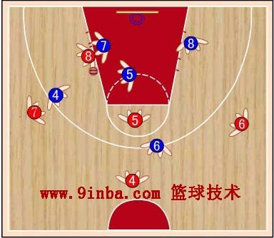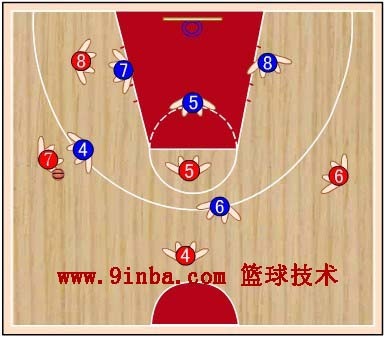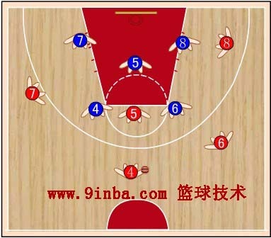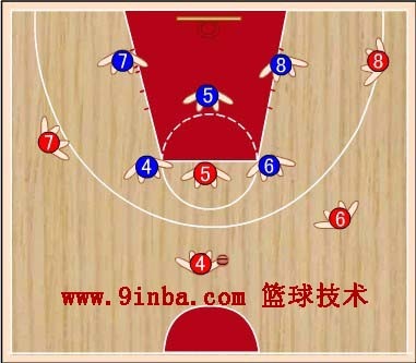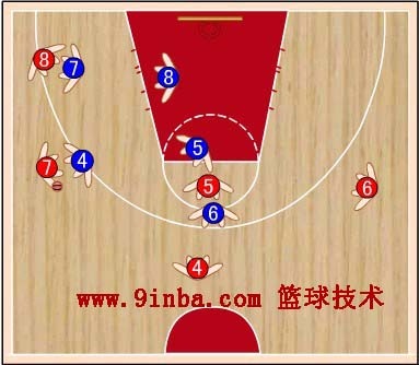 蓝⑧站在红⑧的内侧前方,切断红⑥与红⑧的传球路线,减少红⑧接球。蓝⑦稍向限制区移动,既要协助防守篮下,又要堵红⑦  的背插,还要准备抢断红⑥传给红⑦的横传球。