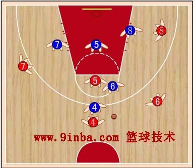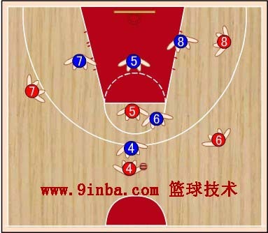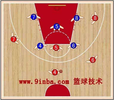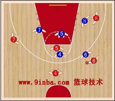 蓝④上去防红④,蓝⑥要稍向右移动,协助防守红⑤,并准备抢断红④传给红⑤的球,蓝⑦向上移动防红⑦,并兼顾防守篮下,蓝⑧防守红⑧向篮下活动。