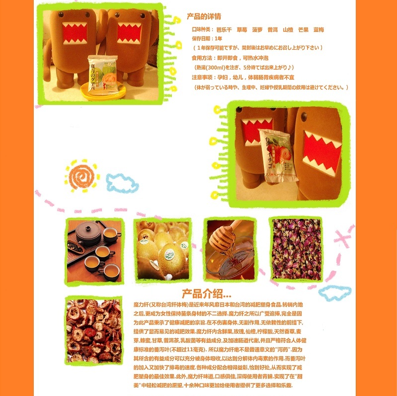 魔力纤(又称台湾纤体梅)是近来年风靡日本和台湾的减肥塑身食品.转销内地之后,更成为女性保持苗条身材的不二选择.魔力纤之所以广受追捧,完全是因为此产品秉承了健康减肥的宗旨.在不伤害身体,无副作用,无依赖性的前提下,提供了显而易见的减肥效果.魔力纤内含鲜果,玫瑰,仙楂,柠檬酸,天然香草,麦芽,蜂蜜,甘草,普洱茶,乳酸菌等有益成分,及加速肠道代谢,并且严格符合人体健康标准的番泻叶(不超过11毫克). 所以魔力纤绝不是普通意义的"泻药".因为其所含的有益成分可以充分被身体吸收,以达到分解体内毒素的作用.而番泻叶的加入又加快了排毒的速度.各种成分配合相得益彰,恰到好处,从而实现了减肥塑身的最佳效果.此外,魔力纤味道,口感俱佳,深得使用者青睐.实现了在"甜美"中轻松减肥的愿望,十余种口味更加给使用者提供了更多选择和乐趣.