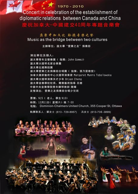 [FONT=楷体]渥太华“爱乐之友”俱乐部将于今年[/FONT][FONT=楷体]12[/FONT][FONT=楷体][/FONT][FONT=楷体]11[/FONT][FONT=楷体]日晚上[/FONT][FONT=楷体]7[/FONT][FONT=楷体]点在[/FONT][FONT=楷体]Dominion-Chalmers United Church[/FONT][FONT=楷体]主办庆祝中加建交[/FONT][FONT=楷体]40[/FONT][FONT=楷体]周年专题音乐会,这将是一场中西文化相结合、内容丰富、高水准的盛会。受邀参加演出的单位包括,明年春季将前往意大利巡回演出的渥太华青年交响乐团[/FONT][FONT=楷体](OYO)[/FONT][FONT=楷体]、渥太华大学大提琴协会[/FONT][FONT=楷体](University of Ottawa’s I Cellisti Cello Choir)[/FONT][FONT=楷体]重奏组、渥太华北国舞蹈团等。除此之外,俱乐部还邀请了渥太华著名大提琴演奏天才少年[/FONT][FONT=楷体]Bryan Cheng ([/FONT][FONT=楷体]程硕聪[/FONT][FONT=楷体])[/FONT][FONT=楷体]、加拿大国家艺术中心[/FONT][FONT=楷体](NAC)[/FONT][FONT=楷体]大提琴演奏家[/FONT][FONT=楷体]Margaret Munro Tobolowska[/FONT][FONT=楷体]、渥太华音乐学校[/FONT][FONT=楷体](Ottawa School of Music)[/FONT][FONT=楷体]校长、声乐艺术指导吕珊、曾任教中国中央音乐学院优秀青年钢琴教师陈辉等登台献艺。在这里,观众们不仅会欣赏到[/FONT][FONT=楷体]Bryan[/FONT][FONT=楷体]与大提琴演奏师们的合奏,还会领略到两位中国新生代艺术家的联袂演出,更有机会一睹[/FONT][FONT=楷体]NAC[/FONT][FONT=楷体]大师的风采。他们将为音乐会划下一道道精彩美妙的风景线。[/FONT] [FONT=楷体]