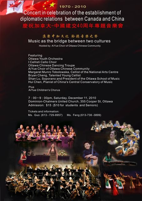 [FONT=&quot]Since 2000, Ms. Zhang has been visiting Ottawa regularly as an artistic consultant for various choirs of the Chinese community, and later established the AiYue (love for music) Choir of Ottawa Chinese Community (ACOCC) as well as its Children’s chorus, dedicated to promoting and building capacity for vocal and choral arts with educational and performing outreach in the community as well as the nation’s capital region. She has been conducted the AiYue Choir on various popular occasions including the 2008 Charitable Concert for Sichuan Earthquake, 2008 Parade for Beijing Olympics, 2008, 2009 Tulip Festivals, and directed the Choir in holding their first exclusive concert at the Kailash Mital Theatre in late 2009. [/FONT]