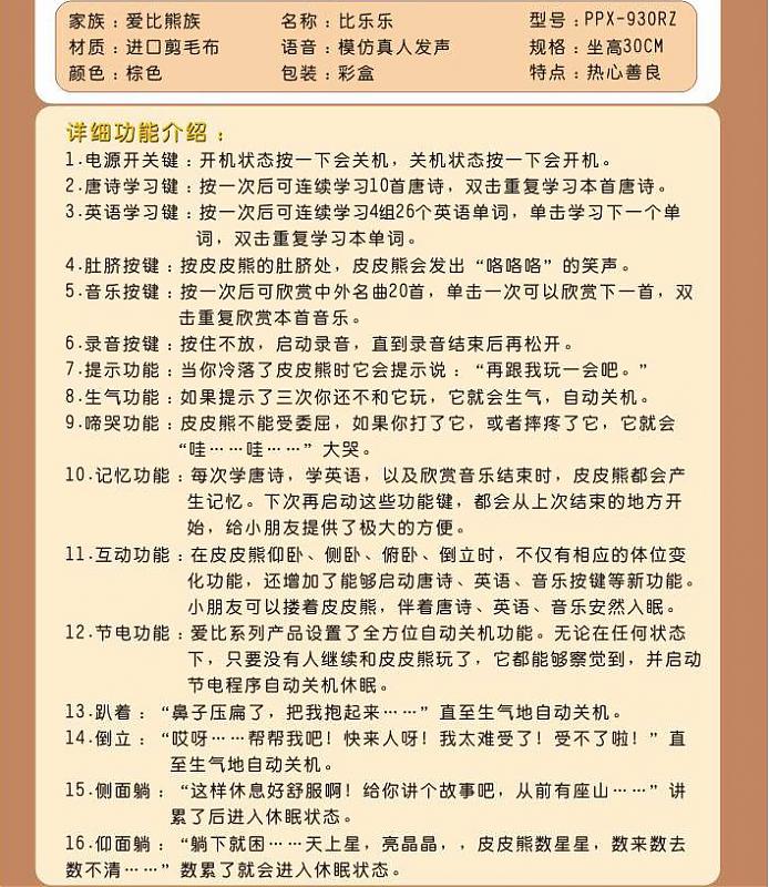 gomu 知名会员 VIP 注册 2008-03-06 消息 352 荣誉分数 156 声望点数 103 2010-10-09 #1 卖一ge新d数码皮皮熊, ta有十六项功能:祝福功能 学唐诗功能 学英语功能 音乐功能 笑声功能 仰卧功能 侧卧功能 俯卧功能 倒立功能 提示功能 生气功能 节电功能 记忆功能 互动功能 打哭功能 录音功能 适合0-8岁宝宝. asking $35. please QQH 附件 宗熊.jpg 78.9 KB · 查看: 145 12.jpg 64.7 KB · 查看: 143 Untitled-1.jpg 137.6 KB · 查看: 146
