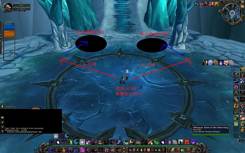 红线是VALKY 飞行路线。一共2条分A区,B区。 具体在什么区域DPS,坦克会CALL.一上来应该是A区域,所有人要求站在LK背后。也就是那条红色的线上,这样VALK 3个都会按照红线的方向飞。大家必然在DPS VALKY, 然后紧接的黑水,马上按照蓝色路线跑道黑水摆放区域A.其他没有中的人远离被点黑水的。继续DPS VALK直到每只都是50%,(同时准备听JASON CALL 换B 区域。