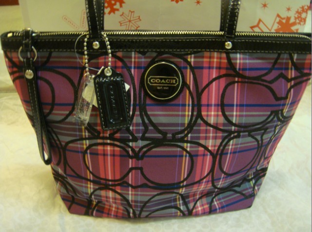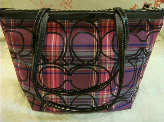 2.全新粉紫色格子coach包包,夏天背的时候很色彩活泼,冬天大衣都是黑色、灰色,感觉蛮沉闷的,配上这个包,感觉就好很多,搭黑色大衣感觉非常的好, 原价大概是$268+tax, 税后 $303,现在试卖$180