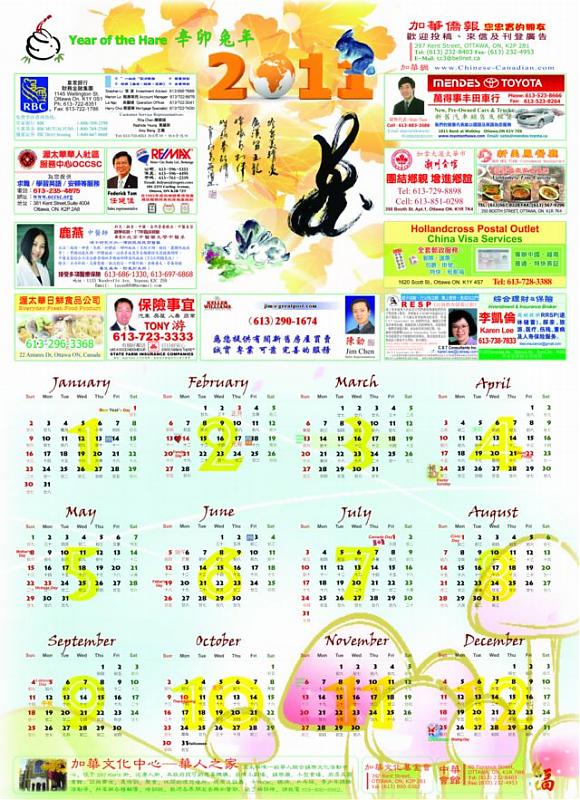 加華僑報 連續十多年出版精美年曆,年年受到熱烈歡迎。今年的年曆更是得到眾多讀者的好評。為答謝廣大讀者的厚愛,現將報社保留的少量剩餘2011年曆繼續免費發放,沒能在大統華、九龍等超市及餐館、中文學校拿到的朋友,可以到397 Kent St. 索取。 希望廣大讀者繼續一如既往支持渥太華唯一的社區週報——加華僑報,謝謝!