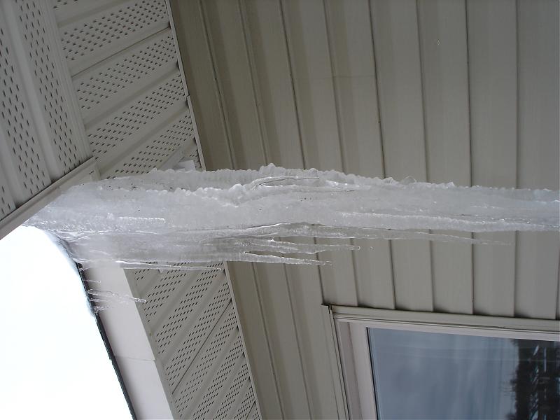 Please see the picture. there is an ice cylinder( might not call this) hanging down from the corner of my townhouse roof. I went out to look around, I did not see other townhouses have this big size of ice cylinder.