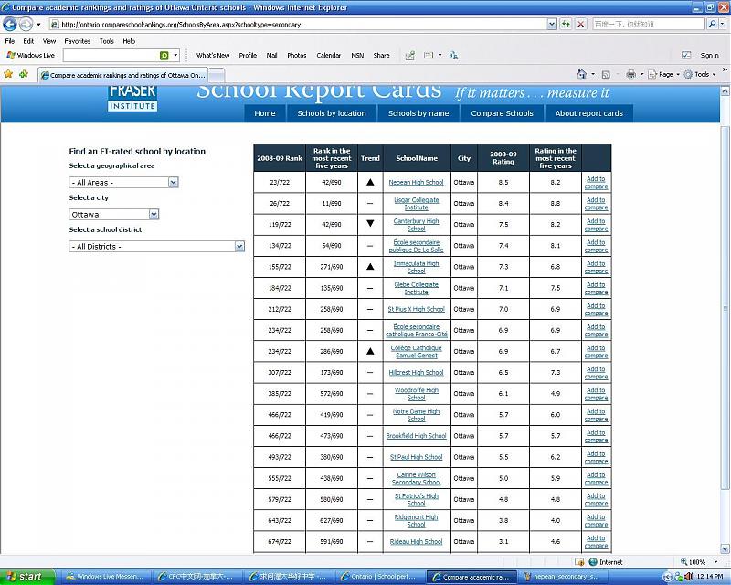 Nepean HS 和 Earl of March HS 是两所没有天才班的学校, 排名一直靠前,也不难上。按我的理解, 目前最好的学校应该是Colonel By HS 和 Lisgar HS, Colonel By 有 IB program, 学校好手云集, 很有一些中国人的孩子最后跟不上,学习压力很大,但是在这所学校拔尖的学生定是全省的尖子了,能跟上, 就是好孩子。 Lisgar HS 好在Gifted Program,老牌好高中。 Glebe HS 和 Merivale HS