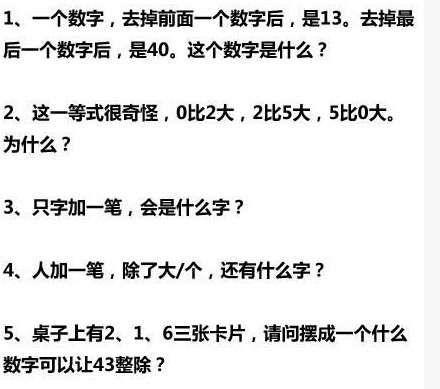 R rosehip Moderator 管理成员 VIP 注册 2012-06-26 消息 19,668 荣誉分数 9,556 声望点数 293 2013-01-22 #65,784 【高智商小测题,非一般人能答对】能答对5道题的人是天才, 答对4道的是帅才,答对3道的是将才,答对2道的是奇才, 答对1道的是人才,1道都想不出来的是X才。 附件 图一.jpg 33.8 KB · 查看: 75