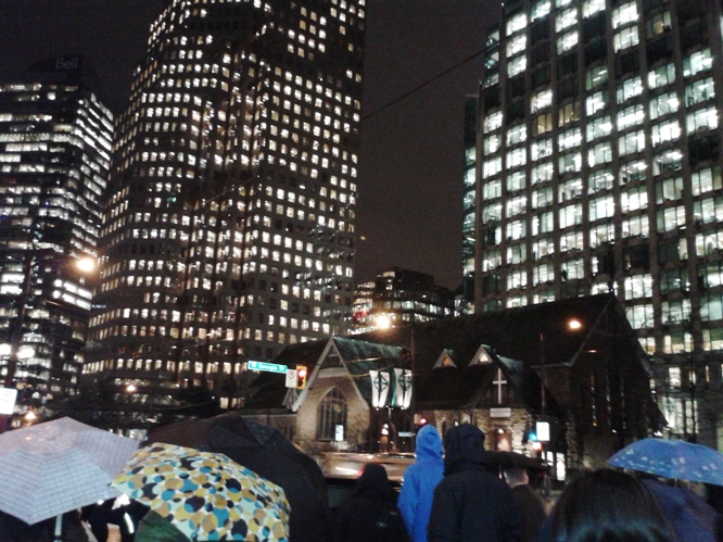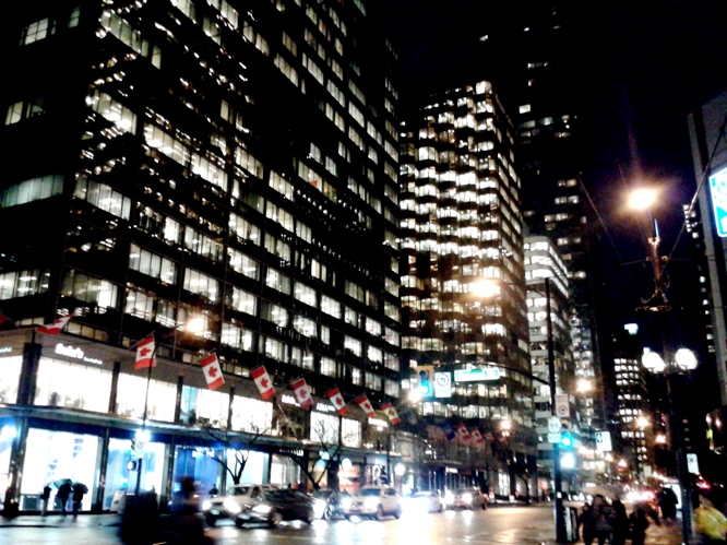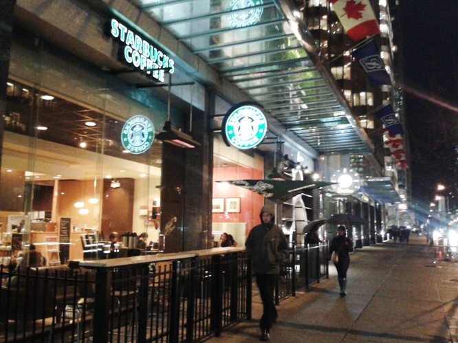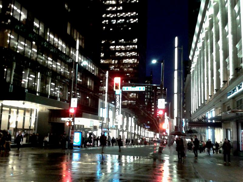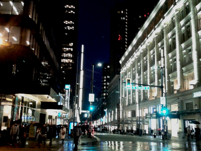 车来了,上车,又堵车。从本拿比回到温哥华downtown快2点,冲到酒店先进洗手间。换了衣服洗了脸,再到楼下逛街。雨下得越来越急,没拿伞,淋湿了一身。街上很多sushi小店,经确认是日本人开的,没二话,挨店吃。