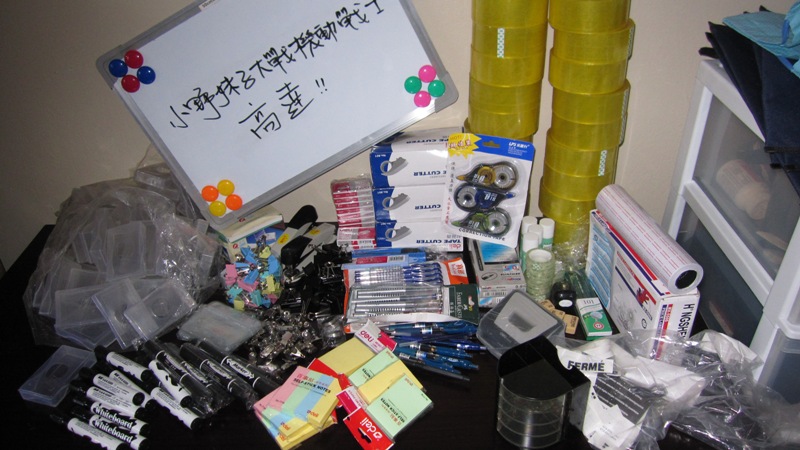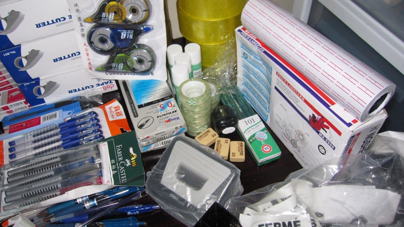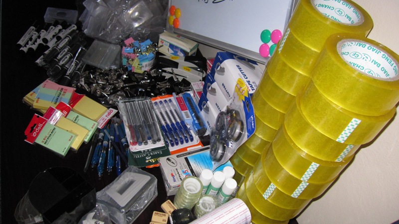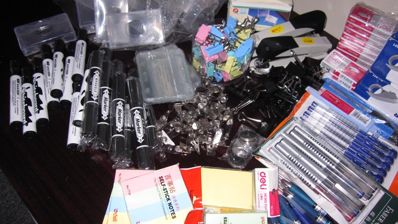 圆珠笔,水性笔,裁纸刀,刀片,笔筒,印泥,订书器,订书钉,打孔器,防水卡,名片盒(两种setting和简易盒),封箱器,封箱胶带,小胶带,胶棒,滑轮,便签贴,长尾夹,白板笔,标记笔,铅笔,橡皮,转笔刀,修正带,小号螺丝钉,文件夹,文件袋,打印纸,皮面本,收纳桌面架