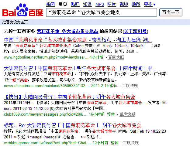 据美联社2月19日(周六)北京报道,中国大陆互联网上出现呼吁民众本周日(2月20日)在中国13个城市参加“茉莉花革命”的讯息,尚不清楚最初的消息来源,北京当局已采取行动阻止该信息在网上蔓延,并对传播该消息的人士展开镇压。