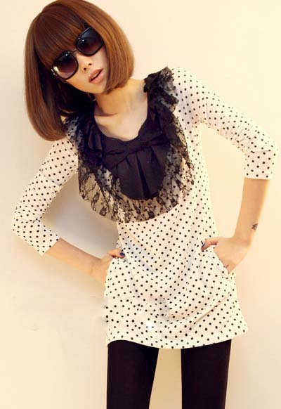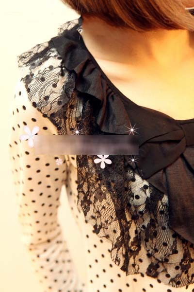 VIVI春季新款甜美蝴蝶结蕾丝领波点T (现货一件哦)