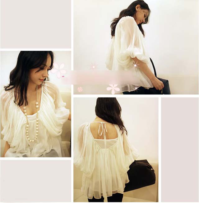 韩版优品精致华丽大蝙蝠袖白色雪纺衫(赠吊带) 优质仿真丝雪纺 白色 均码 肩宽胸围无限制 袖长46 衣长65 看到这款衣衣的时候就觉的眼前一亮 衣衣的面料是仿真丝雪纺,手感特好 里面是全棉的小吊带 个性的灯笼袖与前胸设计极其经典 袖口是松紧口的哦 后肩雪纺带子自然绑在一起,将性感挥洒地淋漓尽致 衣衣不限身材 胖瘦都可以穿滴 拥有它 今夏 你 就是明星。。。