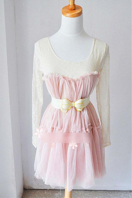 超美公主蕾丝袖抹胸纱裙粉色连衣裙(赠精美蝴蝶结腰带) 优质蕾丝+纱裙 粉色 均码 胸围80-90 衣长75 非常漂亮的一款粉色纱裙 自留了一件哦 腰带是赠送的呢 搭配牛仔,针织都很漂亮 很赞的一件,弹力也较大