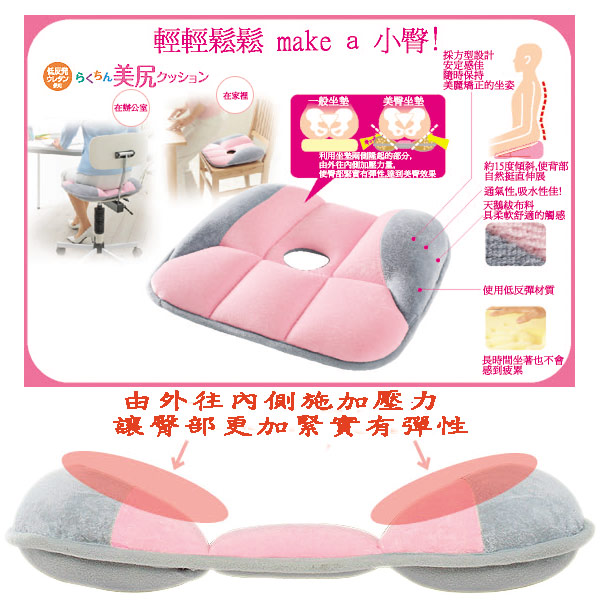 日本瑜珈名人『後藤有美』的強力推薦!除可避免姿勢變形外,還可當做瑜珈動作的輔助器材,讓您擁有健康的美麗姿勢,創造有自信有活力的生活。 利用坐墊兩側隆起的部分,由外往內側施加壓力,使臀部重心保持在內側,讓臀部更加緊實有彈性,塑造『小而美』的臀部效果