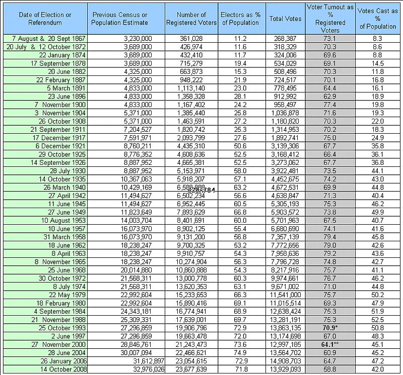 ccc 难得糊涂 管理成员 VIP 注册 2003-04-13 消息 238,068 荣誉分数 37,471 声望点数 1,393 2011-04-06 #530 Election2011 说: 2008投票率为百分之59.1稍低于前最低投票率百分之60.9(发生在2004年,保罗.马丁的自由党赢得了少数政府于)。 历史上,加拿大的选民投票率最高发生在1958年选举时,79.4%占登记选民参加这次选举中,以见证:约翰.迪芬巴克(John Diefenbaker,保守党) 以多数政府掌权。 点击展开... http://www.sfu.ca/~aheard/elections/historical-turnout.html 附件 Image2.jpg 200.7 KB · 查看: 129