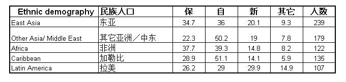 巴里。凯博士论有色人种投票分布: 您这一票投不投,投谁? 依据Ipsos公司2008年选举日研究报告在线样本(35,000人):以下分类没有一类超出250人。{博主按:总计有色人种投票率=782/35000=2.23%/16.20%/42.00%=32.84% (其中没有除去可能的永久居民部分的负面影响)} ---16.20%为有色人种总人口(Visible minorities in Canada) ---42.00%08年投票率(#532 村长引表) --- 10%华裔08年投票