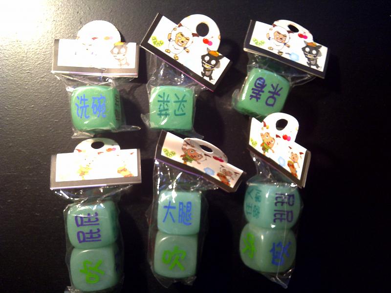 情趣情侣骰子,这种骰子是一对儿的。一只上写有动词,如 吹 摸;另一只上写有名词,如 咪咪 屁屁。 不多解释,你们懂的~