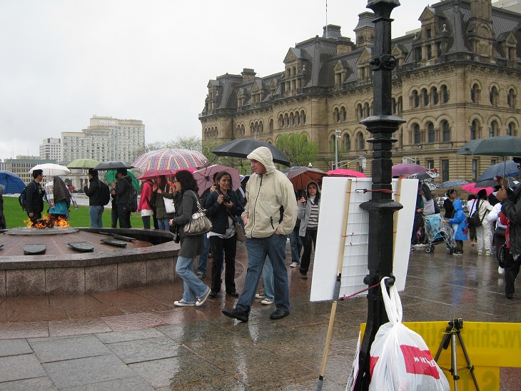 2011年5月14日,渥太华国会山上访抗议六个月又十四天,今天星期六,小雨。今天上午来到国会山,虽然下着小雨,但游客还是非常多,一批接着一批,很多游客来看和来问。还有些游客是从欧洲,美国,南美洲等地过来,看来我来国会山向世界的游客们讲述中国那些贪官污吏的劣迹是来对地方了。