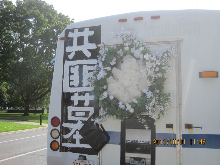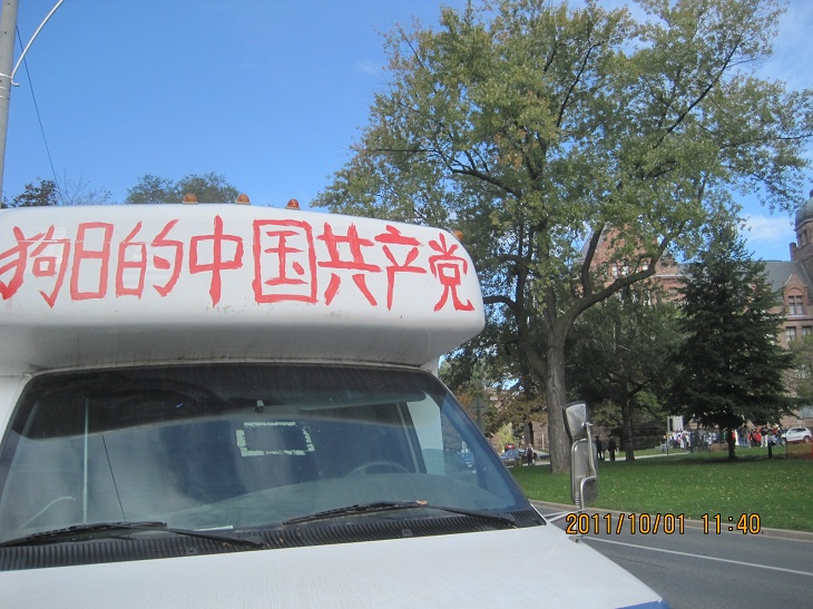 昨天多伦多的张向阳先生也特意开着他的抗议共匪宣传车,抗议中共土匪斧头邦在加拿大安省议会举行 “升邦旗”活动。ZT:满身抗议口号的中巴宣传车满载中共鬼子的墓碑和花圈,连续围绕升旗小广场行驶一个半小时,活动最后,警察要我把中巴抗议车停在广场出口处“接受检查”,这样,参加活动的就能更近距离“参观”和拍照。随后,中巴抗议车前往中共鬼子驻多伦多总领事馆,新疆维族也在抗议中共鬼子!