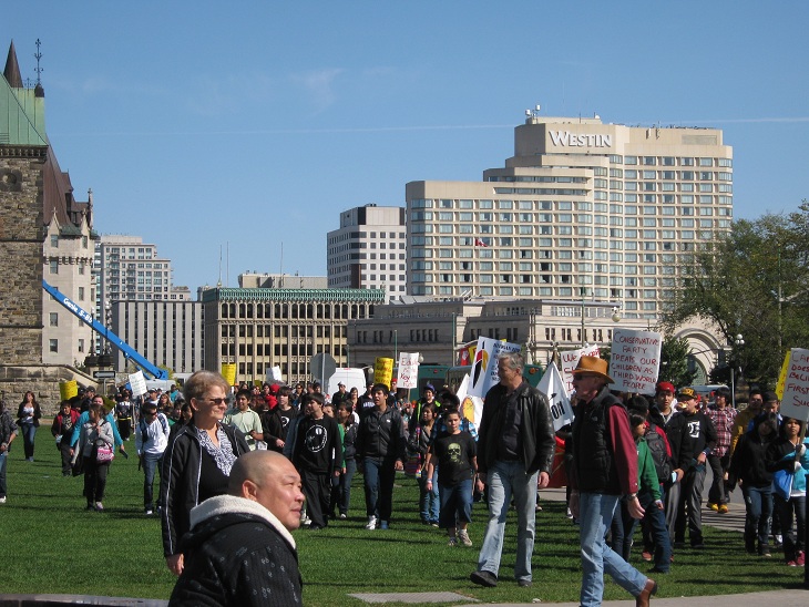 2011年10月6日,渥太华国会山上访抗议十一个月又六天,今天星期四,晴天。今天天气也是很好,除了游客外,还来了很多的示威的学生和一些原住民,是抗议关于政府教育方面问题。