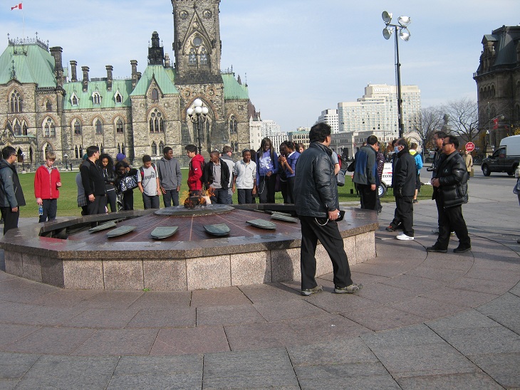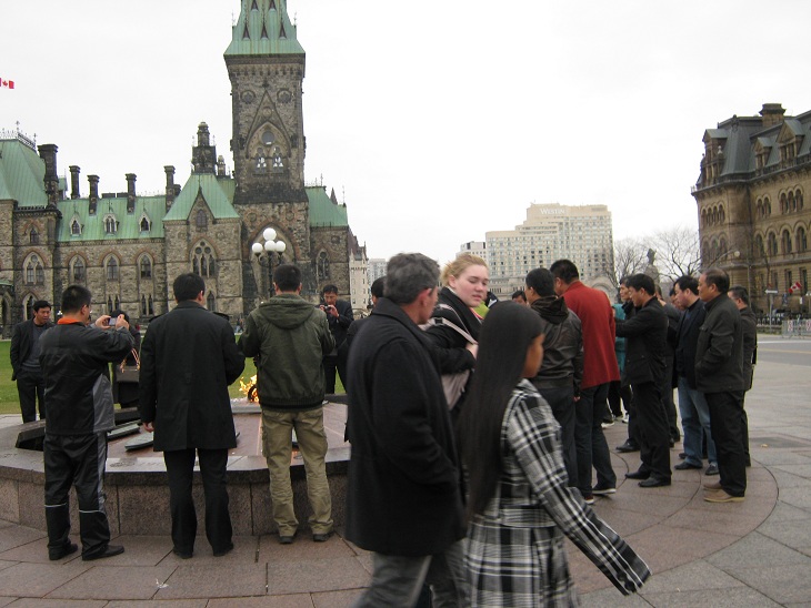 2011年11月9日,渥太华国会山上访抗议一年又九天,今天星期三,多云。今天天气不错,来国会山的游客也很多,下午还来了几辆中国旅游大巴,其中一对同胞都是摄影爱好者,2人拿着专业相机对共产党墓碑和我拍了好几张。