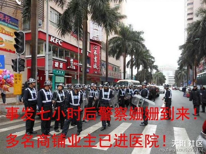 据现场群众和商户诉说,无良开发商纠结了200多名黑社会人员,个个手持一米多长的大砍刀,铁棍,阻扰维权商户和群众,暴力强拆!砍伤打伤多名商户及路人!现场血迹斑斑!目前伤者正在龙岗第二人民医院救治!一名受害者危重,正在抢救,多名重伤轻伤!据现场目击人员反映,辖区内派出所民警到场后,黑社会人员当着民警的面,追砍商户!