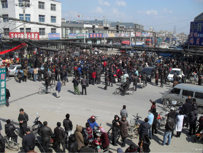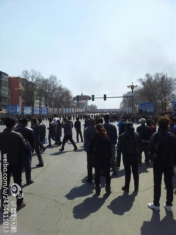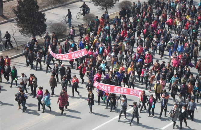 2012年4月9日上午,黑龙江牡丹江市北安乡,1400名放牛沟村农民上街示威(第一视频),抗议村干部以权谋私、私自买卖集体土地。