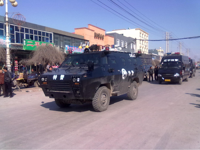 ZT辽宁村民反污染砸镇政府 特警装甲车镇压。
