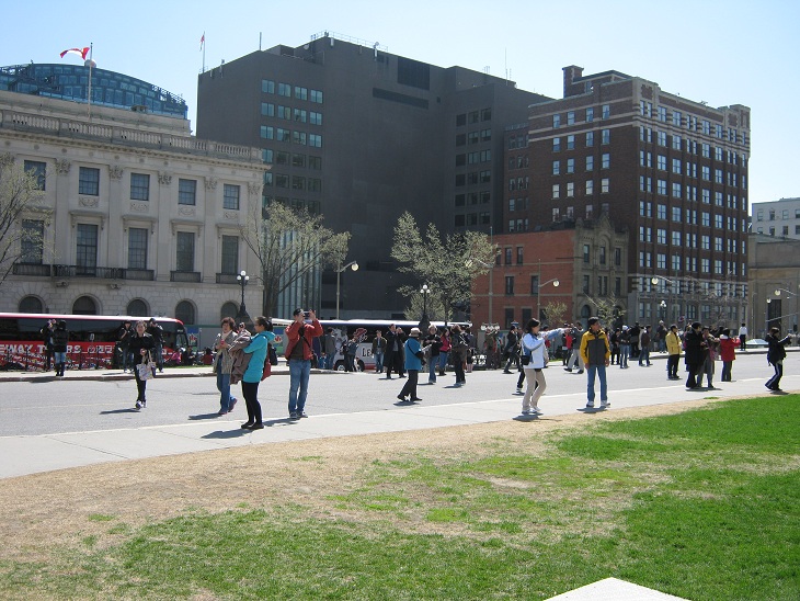 2012年4月9日,渥太华国会山上访抗议一年五个月又九天,今天星期一,多云。今天由于还是假日,来国会山的游客也不少,还遇到2辆中国旅游大巴车。