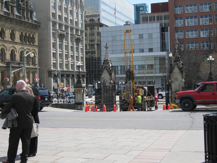 2012年4月19日,渥太华国会山上访抗议一年五个月又十九天,今天星期四,多云。今天来到国会山,在远处就听到隆隆的机器声,走进一看原来是国会山正门入口处正在施工。