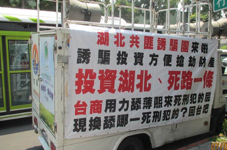(zt大纪元)针对中共湖北省长王国生7日率上百人访台,受害台商团体于下午举办“黑暗湖北车队大游行”,在游行前焚烧五星旗,抗议湖北省发生受害台商丁秀云案、湖北武汉市大陆配偶朱依婕案,反对王国生不但不解决受害台商问题,竟还来台招商引资。同时,受害台商团体提醒,投资中国前务必先询问曾受害台商的经验,以防不测。