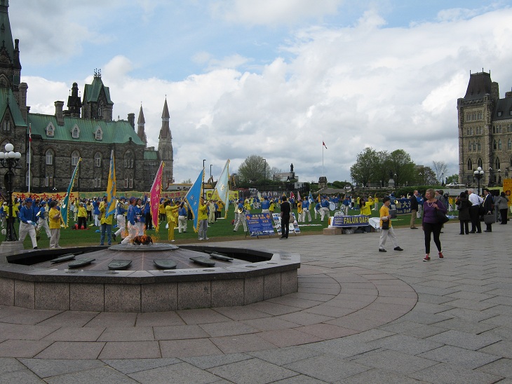 2012年5月9日,渥太华国会山上访抗议一年六个月又九天,今天星期三,阴天。今天国会山非常热闹,除了很多的游客,还有法轮大法的学员们在纪念集会。