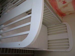 白色实木结构。床和床垫 8-9成新,无破损或划痕。 婴儿时期,和普通床一样四面围栏,其中一面可升降。2岁后可把一面换成照片这样的儿童床。没照四面围栏的,被拆掉的一面围栏现放在床底下。 $60.