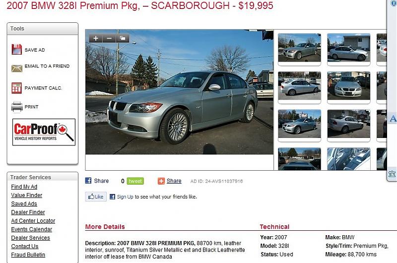 同样是2007年的 328,人家才跑了8w,从dealer那里才1.9w元。而且可以砍价。derek师兄,我觉得你的报价太高了。个人认为1.2w比较合适。