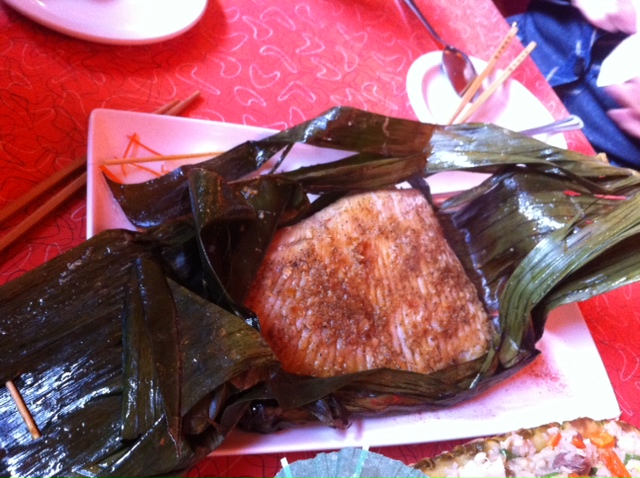 店员推荐荷叶鱼,荷叶包了鱼,撒了香料蒸的,由点咸,味道还行。