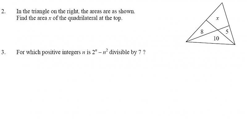 别气馁! 我家孩子也没做出来。不过他的cousin 13 岁把这题做出来了。 我没做出来:blowzy::blowzy:。我家领导用高深的数学公式得出了答案。 昨天,好几个朋友都把solution post 出来了。等高的三角形面积和底是成比例的。 黑向日葵 说: 给孩子看了看考题,孩子很干脆说考不了,孩子自己说只能应付学校考试,我是自做多情了:blowzy: 点击展开...