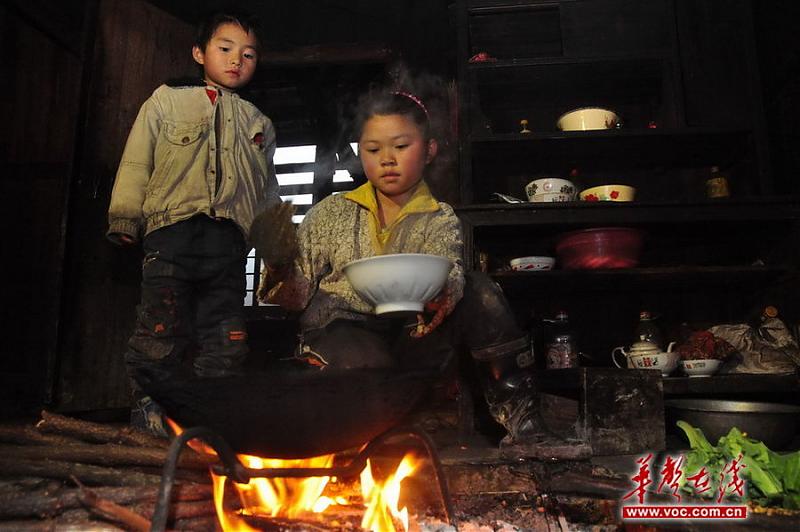 杨紫洲稚嫩的小手和黝黑的铁锅,她从6岁起,就开始自己做饭。