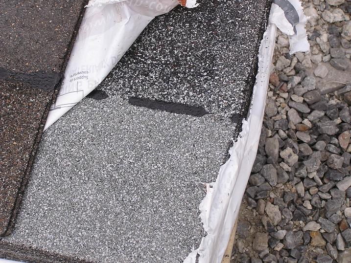 偶尔的一小片吹翻,比较正常,因为三片瓦包装就和architectural shingles不一样。architectural shingles包装“自我保护”,三片瓦暴露在外面,在搬运过程中很容易破坏ROOF CEMENT.从而“粘不上”。所以风大容易折翻。