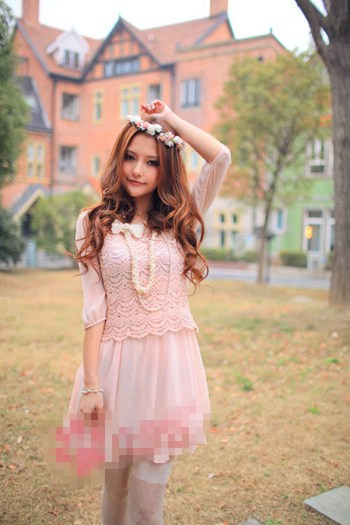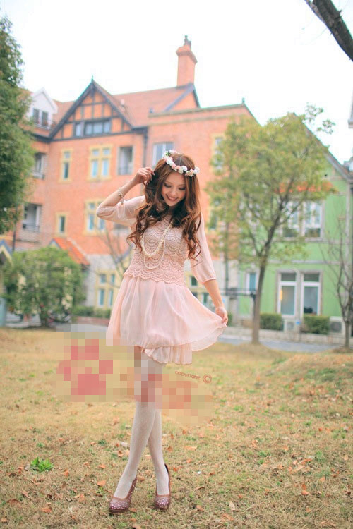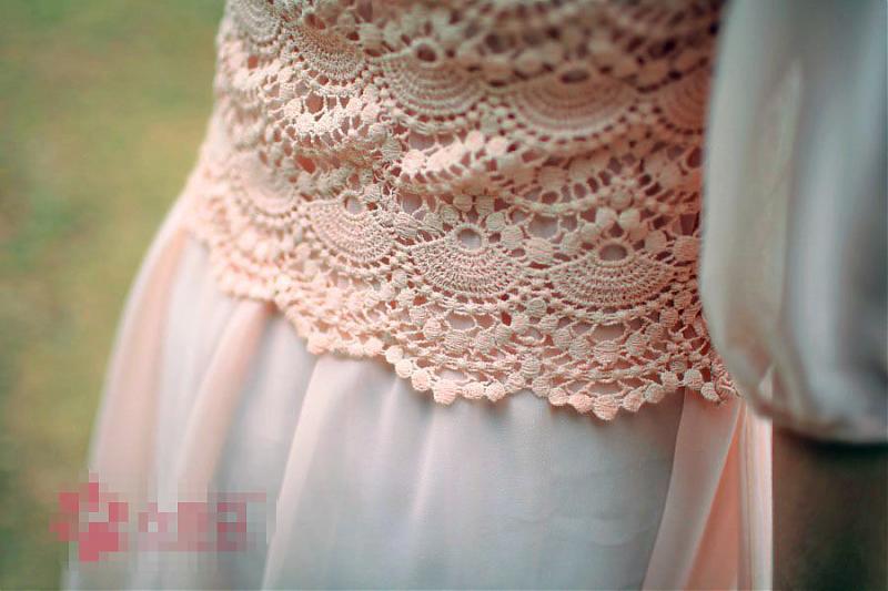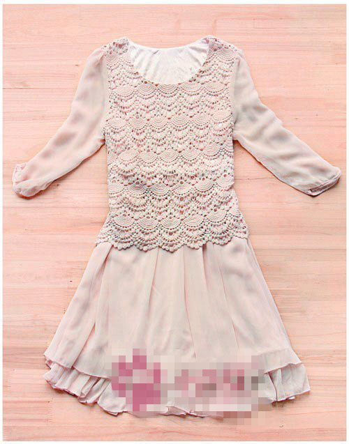 钩花蕾丝七分公主袖假两件雪纺连衣裙 【 颜 色 】: 粉 【 面 料 】: 蕾丝+雪纺 【 尺 寸 】: 裙长81 肩宽33 领口20 胸围70-94 袖长40 袖口20-24 腰围72-94 下摆120-140(cm) 【 模特资料 】: 身高164cm 体量43kg 三围85B 63 86cm 【 备 注 】: 有内里, 有弹性 【 说 明 】: 以上为平铺尺寸,测量方法不同可能存在2-3CM左右误差属正常